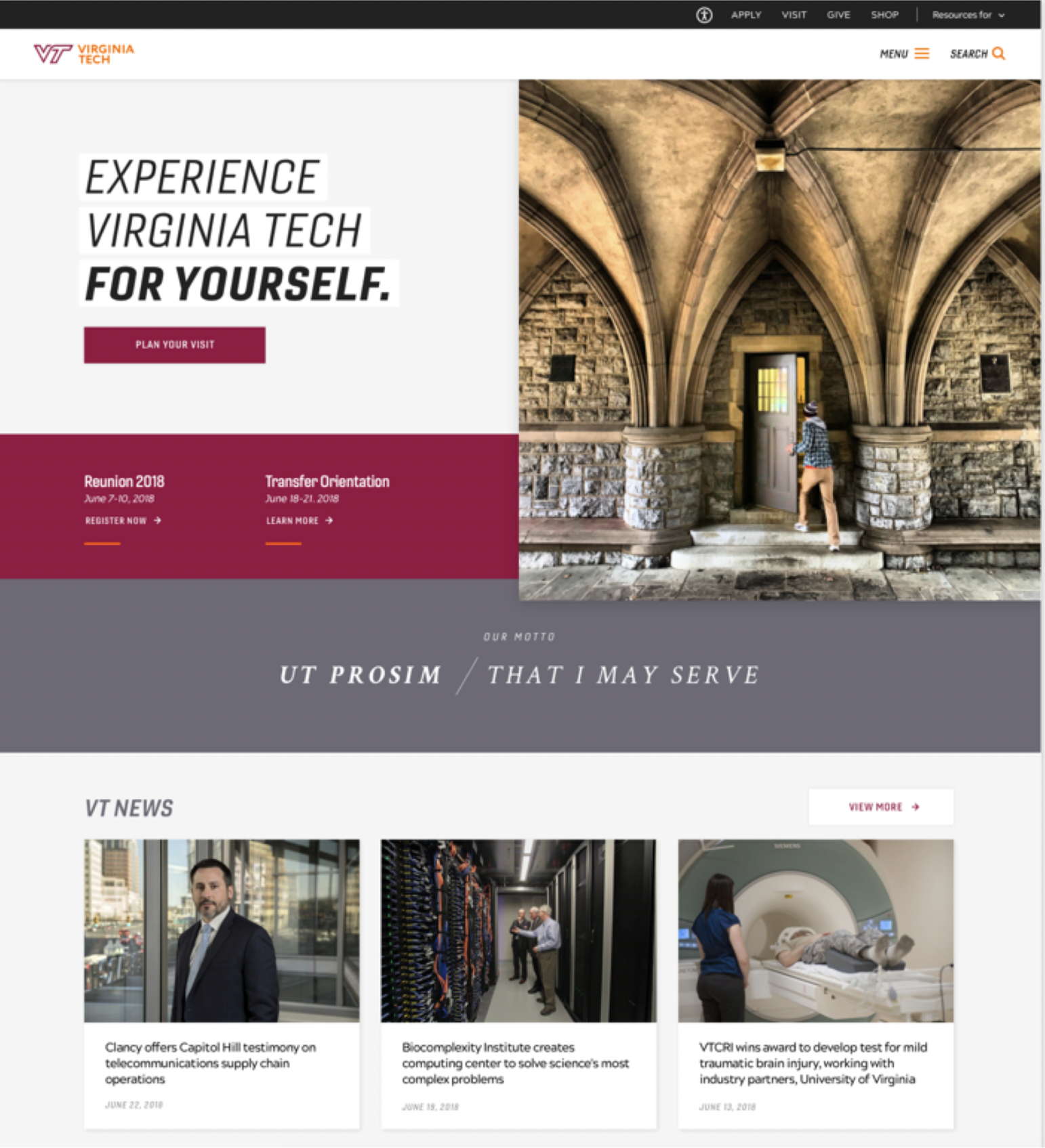 To bring the brand to life online, we created a custom theme for Adobe Experience Manager, which houses hundreds of websites across Virginia Tech, including vt.edu. I served as the product owner, managing a team of designers and developers to create the front-end experience.